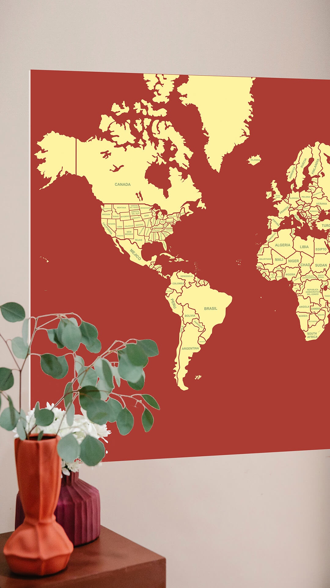 The only printed world map where you can choose the color of land, ocean and the names of the countries.
