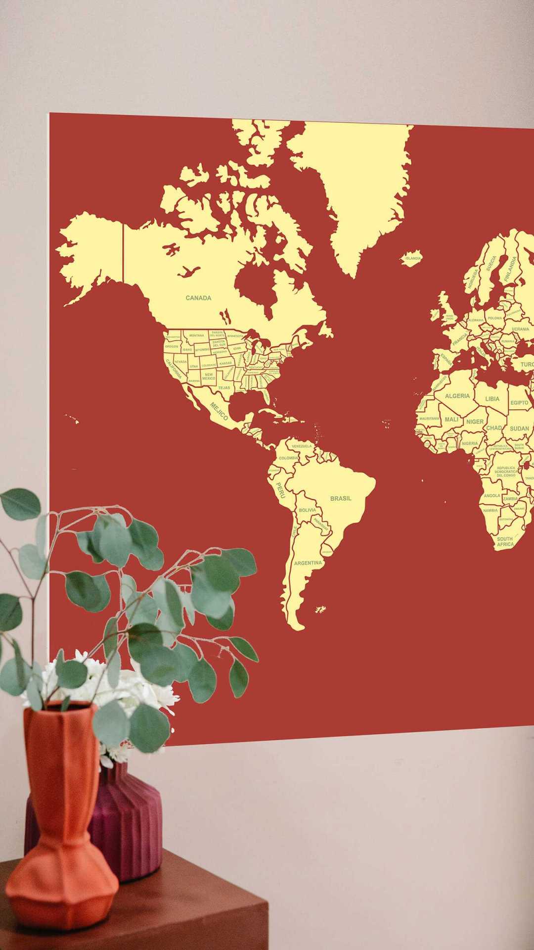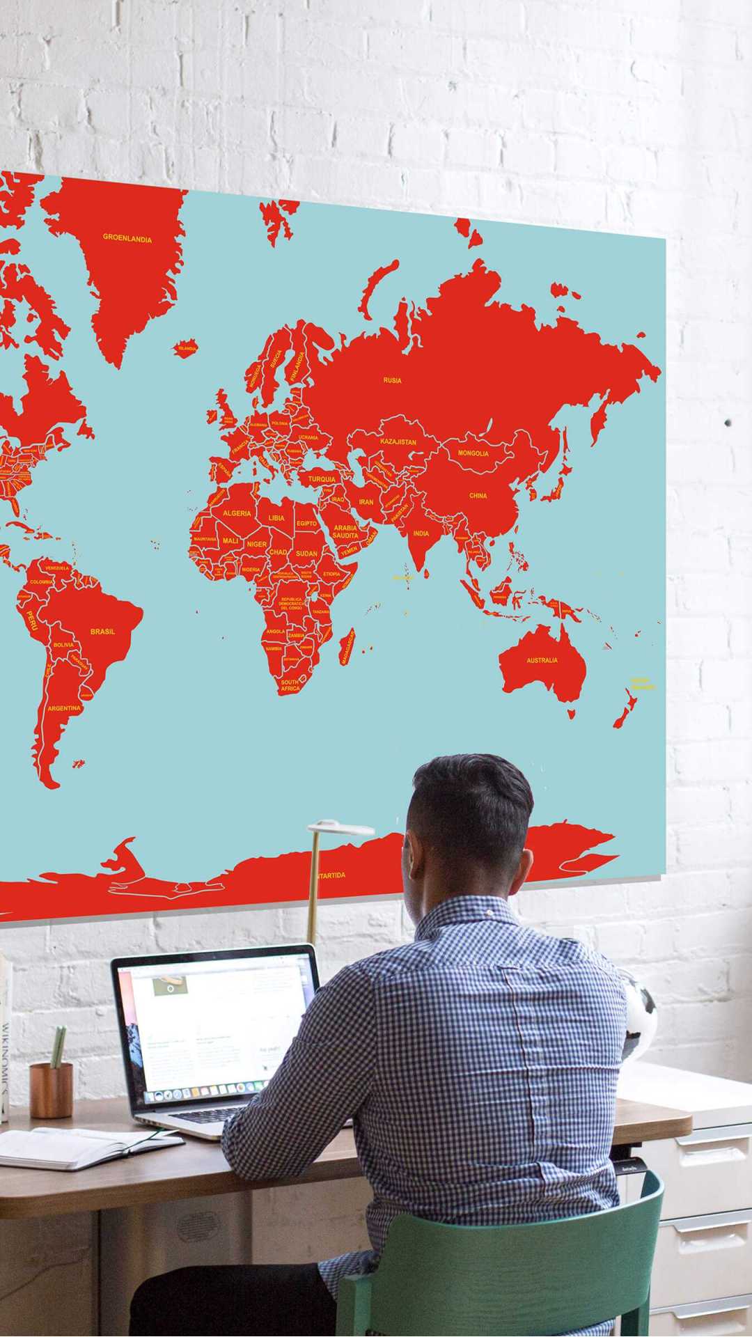 The only printed world map where you can choose the color of land, ocean and the names of the countries in spanish.
