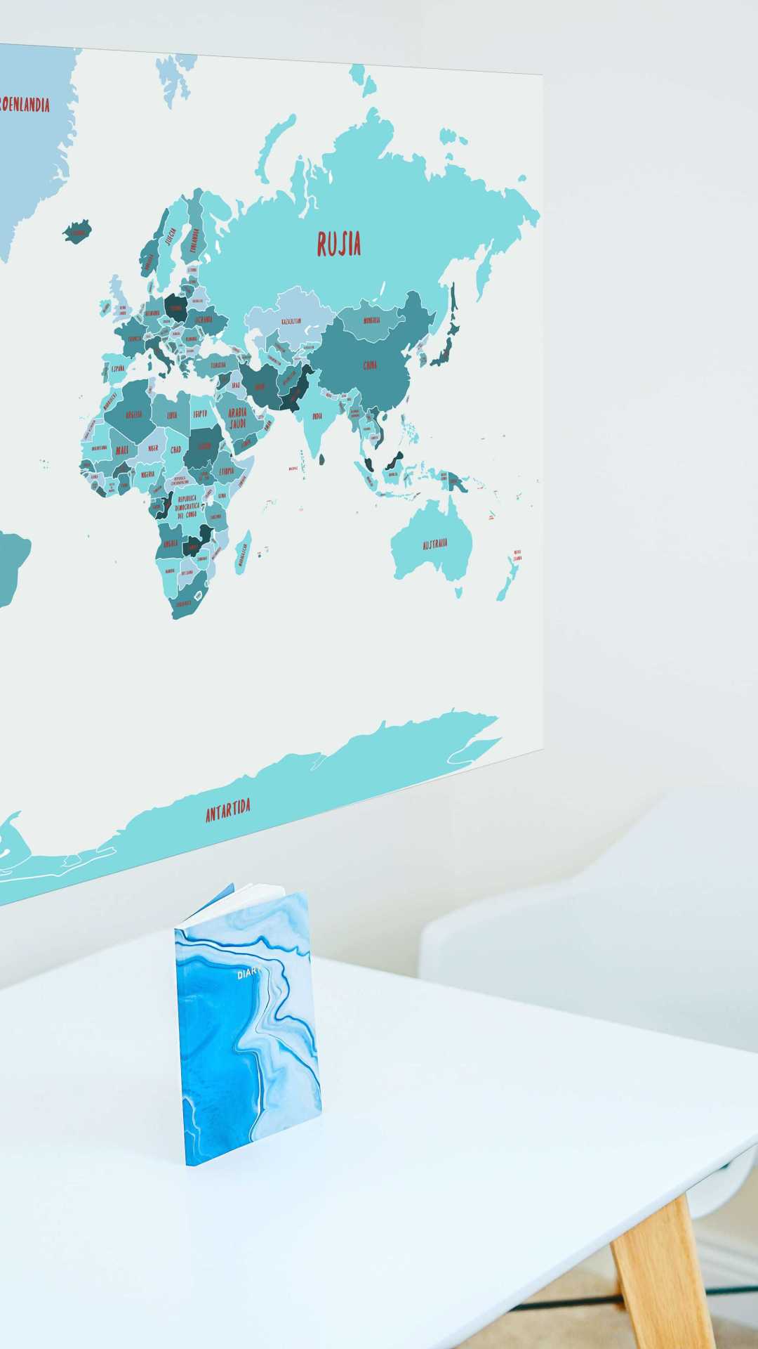 The only printed world map where you can choose the color of land, ocean and the names of the countries in spanish.