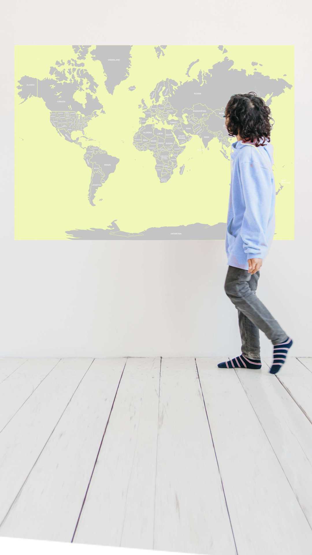 The only printed world map where you can choose the color of land, ocean and the names of the countries.