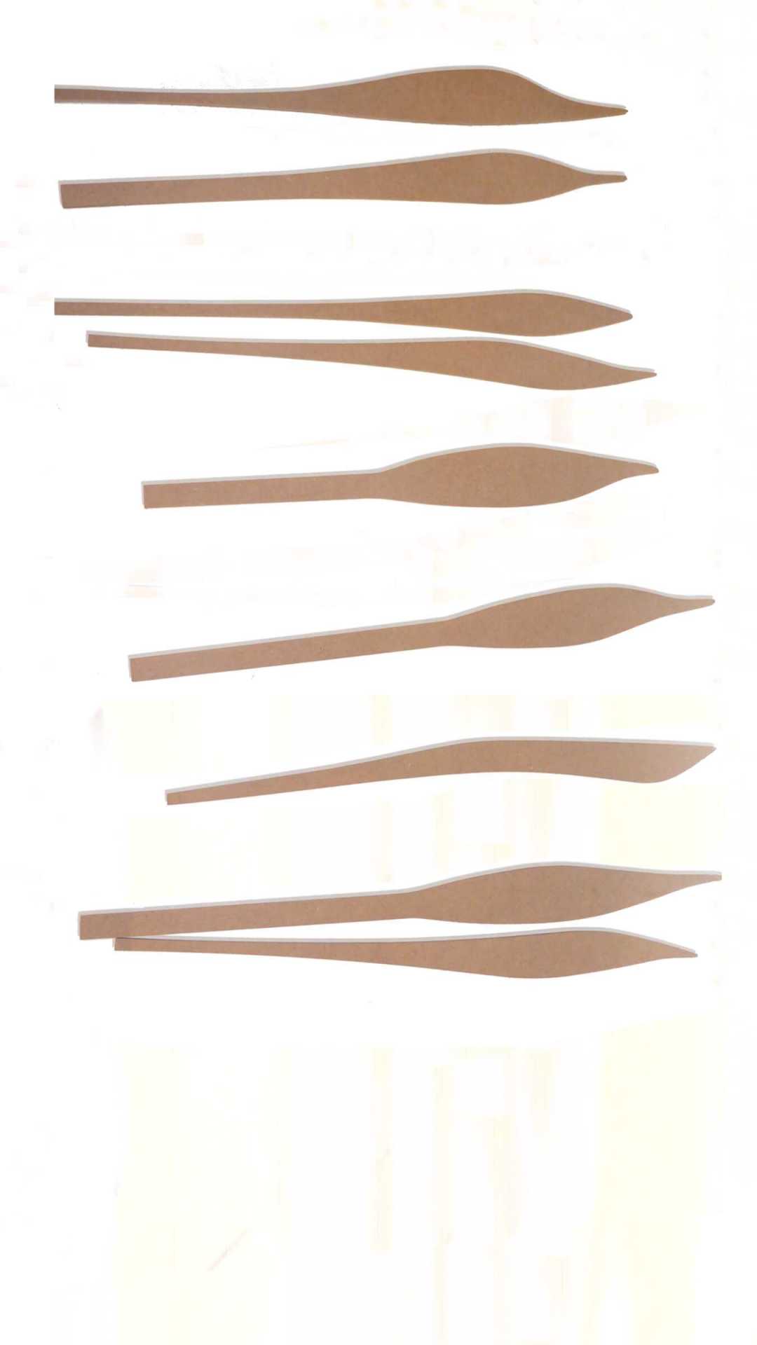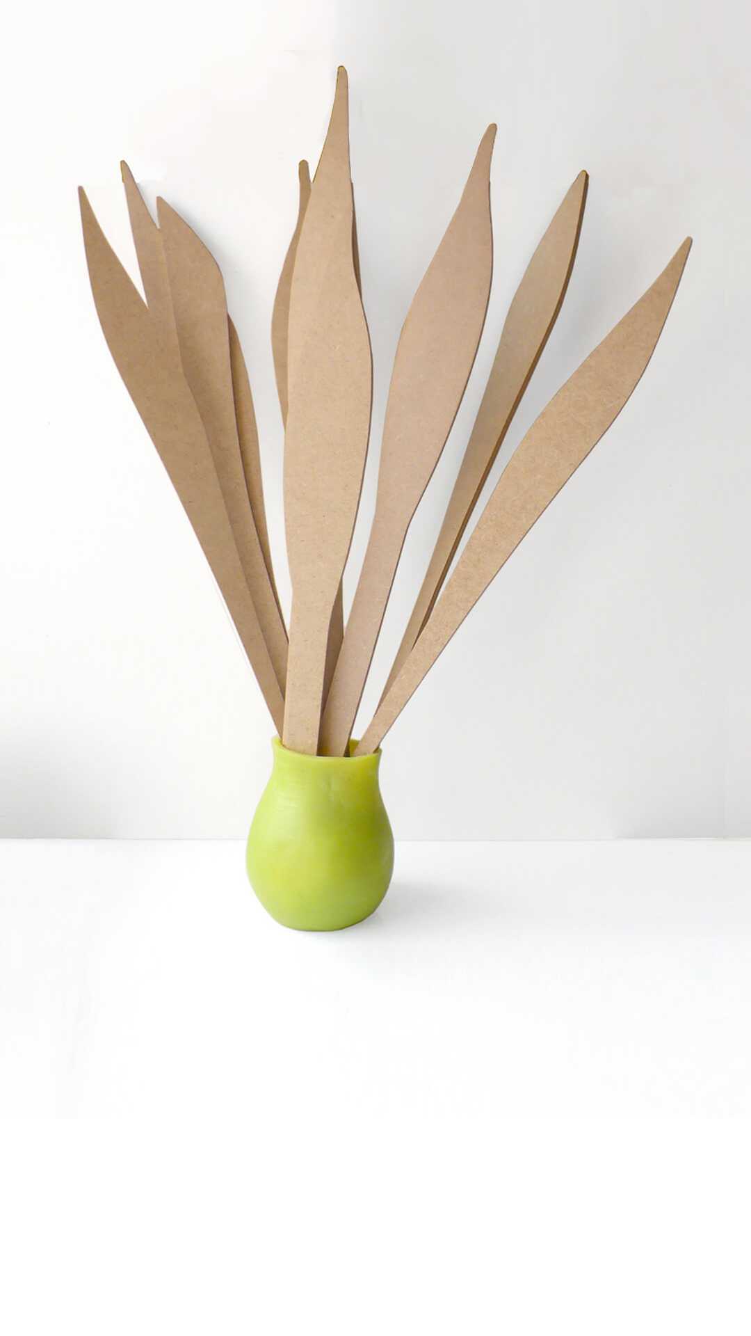 Son 9 hojas de dm de alturas variables, la más alta mide 64 cm, sólo tienes que llenar una maceta con piedras para hacer la composición que más te guste.