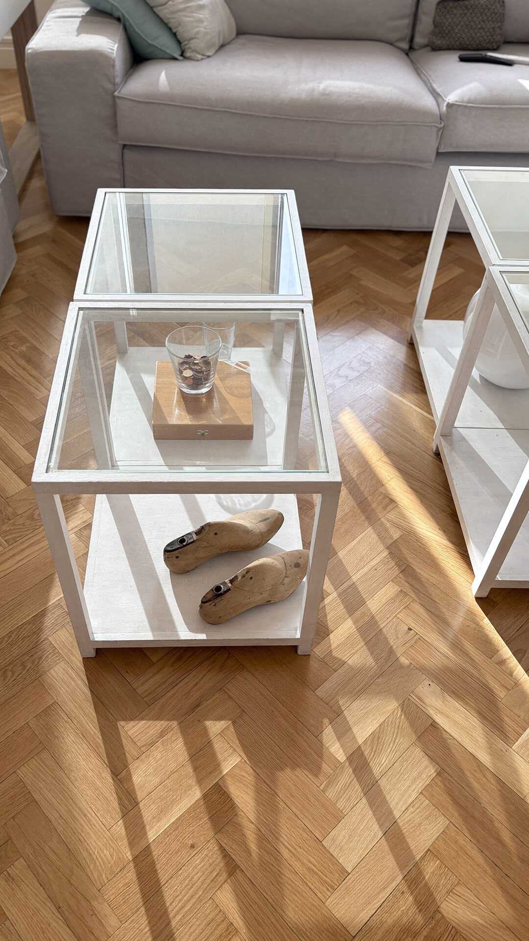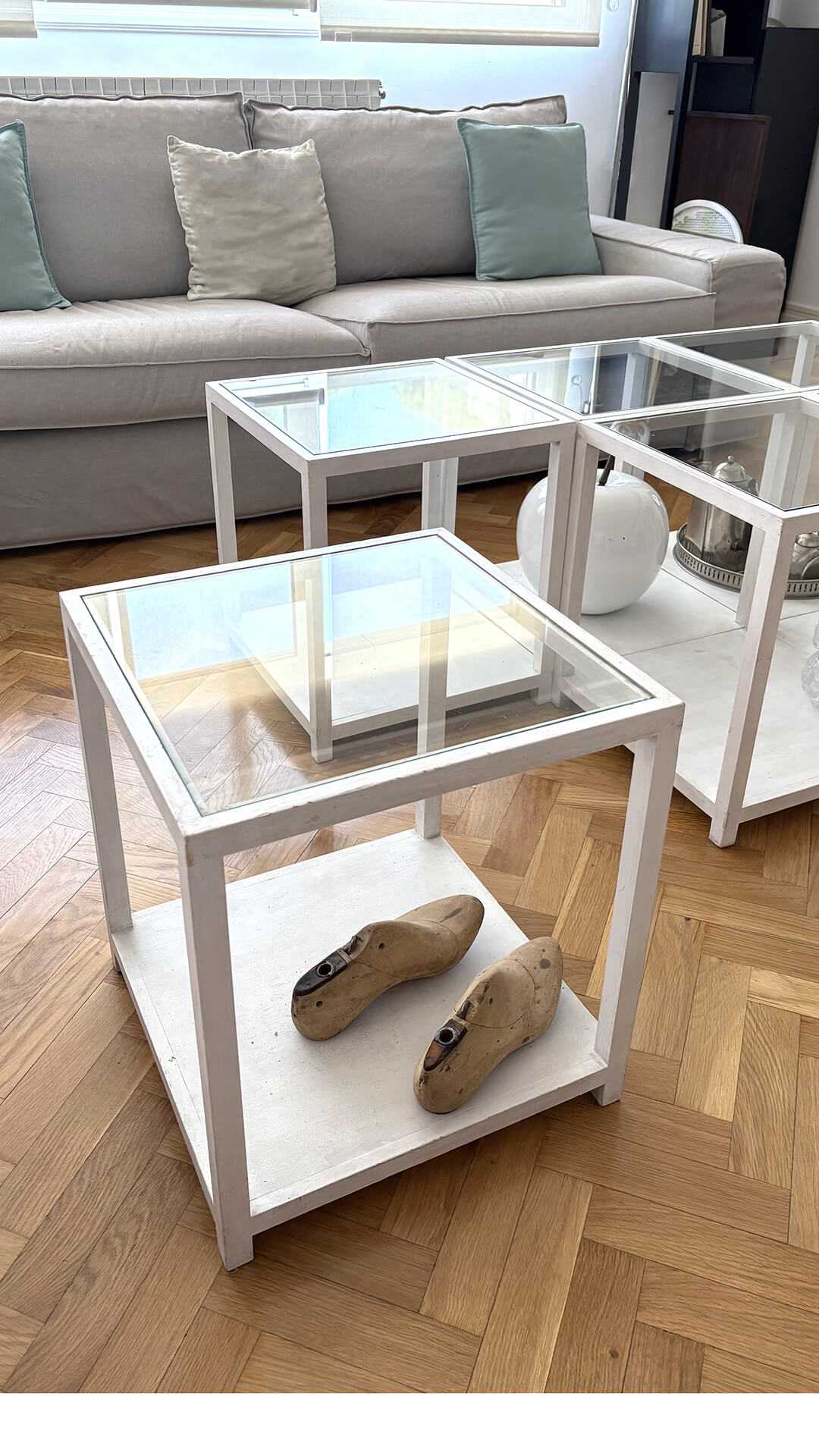Conjunto de mesitas de centro, de líneas ligeras. Realizadas en madera de pino y cristal, en crudo, para que las acabes tú como quieras.