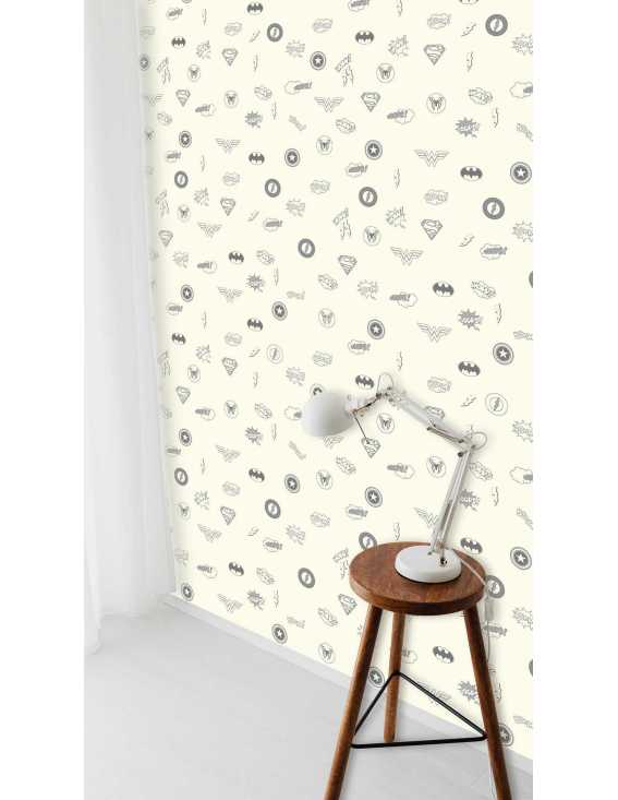 Papel pintado infantil con diseños de símbolos de superhéroes y cómic, perfecto para decorar paredes de habitaciones infantiles y crear ambientes temáticos divertidos. en colores neutros.